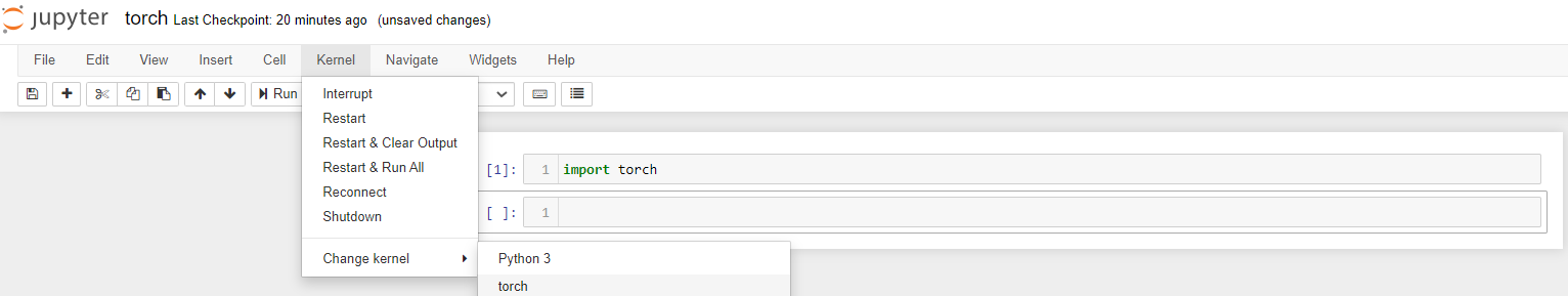 - As noticed, after running following commands, new kernel “torch” is detected and command import torch works successfully